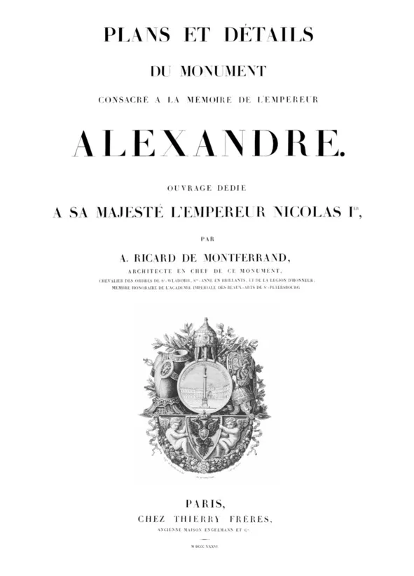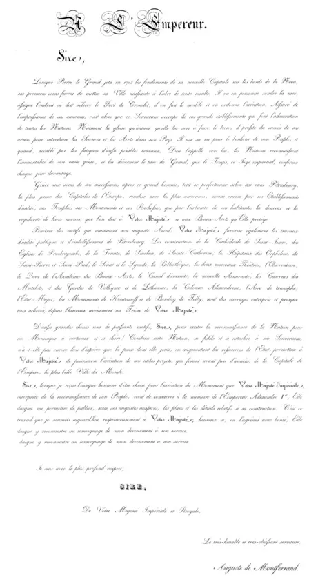 Когда Рим триумфально привез из Александрии свои галеры, нагруженные очень большими обелисками Египта, и поместил их на площадях, Рим доказал миру, что нет ничего невозможного для человека, если он движим твердой волей и чувством собственного величия. Легко понять, что, проникнувшись схожими идеями некоторых предшественников, я осмелился начать создание монумента памяти императора Александра Ι.