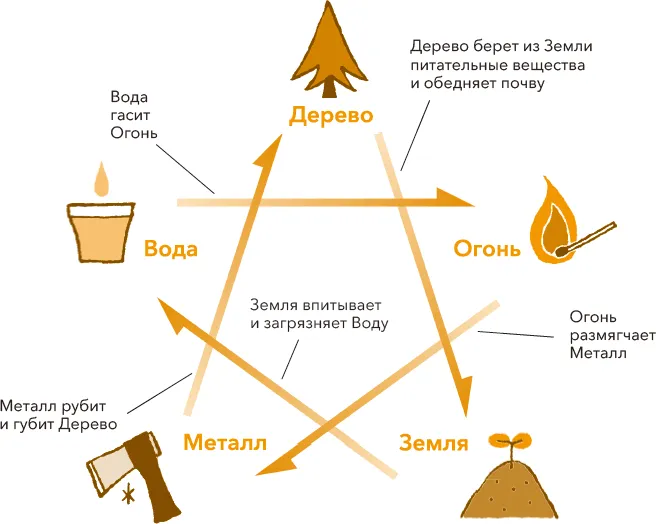 К примеру, металлы естественным образом образуются в земле, поэтому первоэлементы Металл и Земля производят регенерирующую Ци. Металл и Земля питают друг друга и вследствие этого находятся в отношениях взаимопорождения.