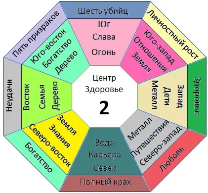 Число Гуа 2 принадлежит западной группе, стихия – земля, цвет – желтый, красный, направление – юго-запад. В традиционной системе знаний фэн-шуй считается, что люди с числом Гуа 2 обладают только энергией Инь, они податливы, ориентированы на партнерство, жертвенны. Считается, что большие достижения и свершения не для этих людей, они люди уюта, гармонии, создающие благоприятную атмосферу для всех вокруг. В действительности это не всегда так, (помните, что основа в астрологической карте рождения).