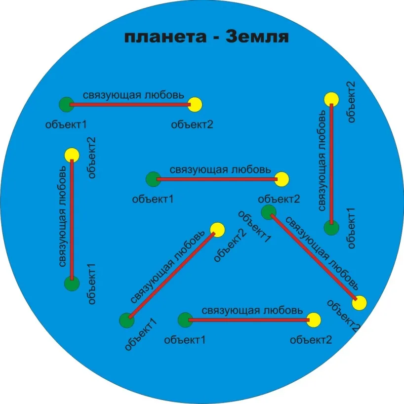 Иными словами, влюблённые парочки находятся в разных концах планеты, любят друг друга, создают прекрасные семьи, и всё это схематично выглядит примерно так, только в значительно большей концентрации. Похоже на срез сосуда или вены, словно бляшки лейкоцитов в крови каждого человека, не знаю, к чему я это, но видимо зачем-то аналогия такая выдалась. И что мы видим? Мы видим несвязанную, разрозненную систему любовных связок, присутствующую на планете.