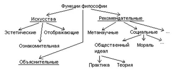 Как видим, далее общего описания мы не идем, и идти не можем. Возможно, конечно, и какое-то иное представление функций философии (от перемены мест слагаемых сумма не меняется). Можно было бы в отдельную рекомендательную функцию выделить эвристическую, ибо она одна из основных, а также работает во всех иных функциях (да-да, это не только наука. В конце концов, откуда взялась демократия, конституция?). Но, несмотря на некоторую поверхностность предложений схемы, она всё же замечательна тем, что показывает нам саму философию; по одним только функциям здесь уже можно вполне ясно представить и определить себе философию. Все общепринятые сейчас философские функции входят сюда, но те структуры не отражают сути вещей, а потому окститесь и вслушайтесь (а ещё лучше – задумайтесь), ибо правда была сказана.