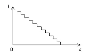 Так событие никогда не наступит, никакая вещь полностью не изменится, ибо до события всегда будет 0,0…01 с, 0,0…001 с; 0,0…0001 с и т.д. В общем, сие – известная апория Зенона. Конечно, жутко хочется обозвать всё это софизмом (не нравится, а сказать нечего софизм), но никакой софистики здесь нет; всё в пределах действия законов логики и без нарушения оных. А задачка не решается. Если, конечно, не применить дискретность. Если же мы применяем дискретный подход, то проблема сразу же снимается. Вышеприведённый график будет выглядеть уже следующим образом (рис. 2):