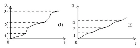 Здесь З – знание, t – время (все, конечно, очень образно). Первый рисунок – смена парадигм. Как видим, скачки есть революции, пологи участки – развитие науки в русле данных парадигм (1, 2, 3 …). В случае рациональности (правый рисунок) развитие постепенное, меняется только соотношение точек зрения, причем меняется здесь всё далеко не скачкообразно. Но мы почему-то выбираем какие-то отдельные участки и говорим – это один тип рациональности, это другой… А почему именно эти участки? «Так захотелось» – ничего более серьезного мы ответить уже не сможем.