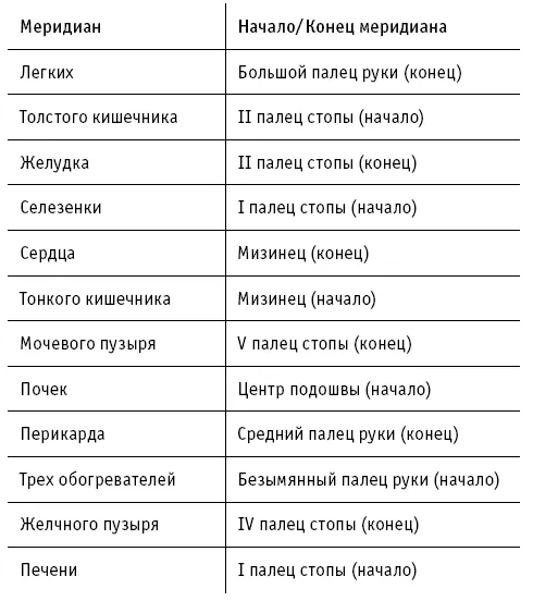 Из приведенных ниже таблицы и схемы становится очевидным, что меняя положение пальцев, можно воздействовать на вход и выход энергии во всех 12 регулярных меридианах.