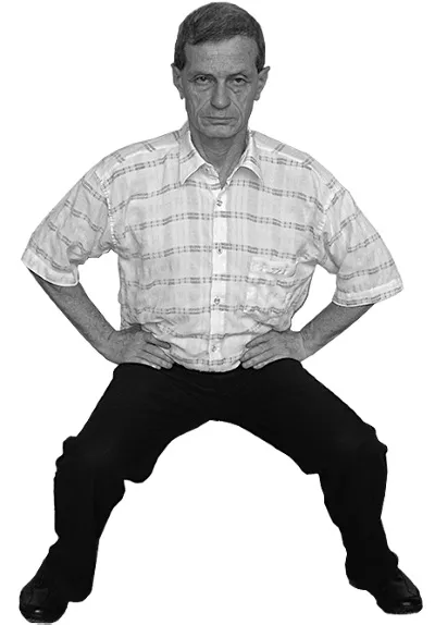 В нашем случае (для столбового стояния в «Красном цветке») используется высокая стойка Ма-Бу: стопы на ширине плеч, колени чуть согнуты. Как принять такое положение подробно описано в разделе «Стояние столбом и пальцевый Ци-Гун».