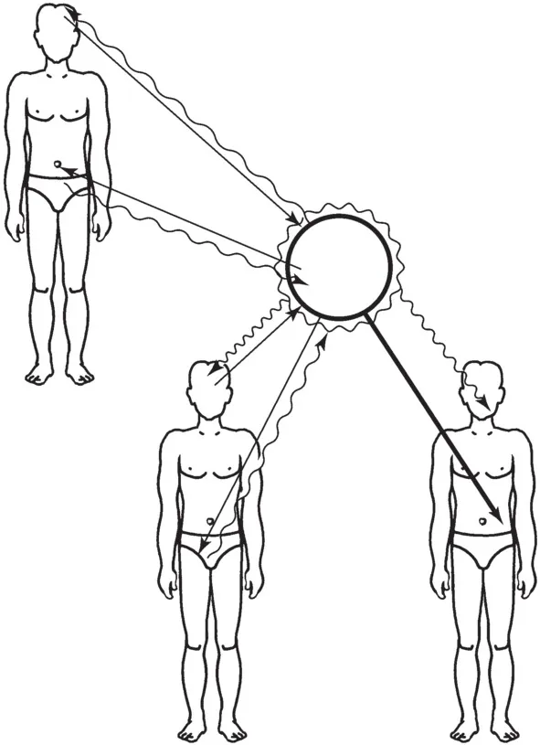 Представьте себе: вот три человека, которые работают вместе в одном кабинете. Первый очень голоден. Его желание пообедать настолько сильно, что оно в виде энергетического выплеска прорывается из нижних чакр и воспринимается верхними чакрами второго человека, который хоть и любит вкусно поесть, но в данный момент не голоден. Но так как идея еды ему очень близка, то его чакры с радостью улавливают эту информацию, и вот он, поймав в пространстве (конечно, неосознанно, на уровне энергетики) знакомый и приятный сигнал о том, что неплохо бы покушать, тоже начинает испытывать симптомы голода. Поток от его нижних чакр тоже подключается к оформлению этой программы.