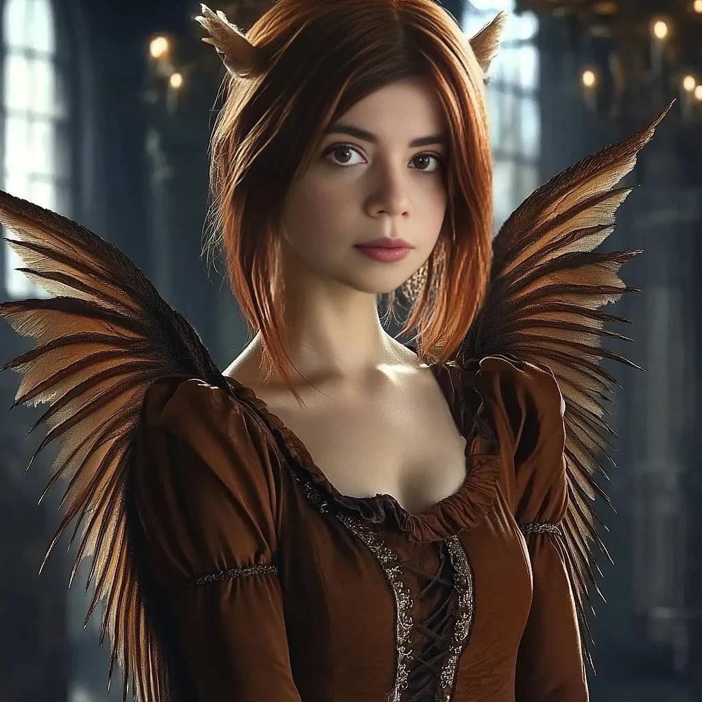 Слегка пухлые губы, изогнувшиеся в слабую, почти извиняющуюся улыбку, делали ее облик еще более трогательным. Простое платье рыже-коричневого оттенка подчеркивало ее стройную фигуру, а его легкая ткань позволяла двигаться с такой грацией, словно она действительно парила в воздухе.