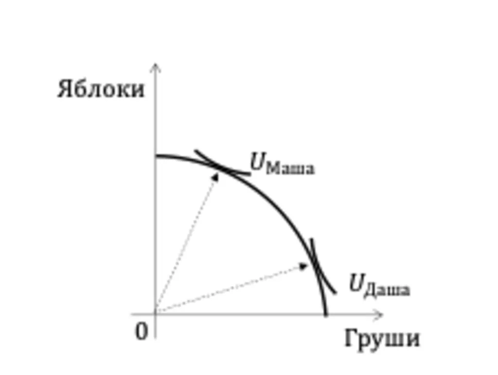 Равное количество фруктов в каждой корзинке экономика представляет выпуклой кривой предложения фруктов, каждая точка которой равноудалена от начала координат. А индивидуальный выбор представляется вогнутой кривой полезности, которая касается кривой предложения. В результате полезности корзинок Маши и Даши UМаша и UДаша располагаются вдоль кривой предложения (Рис.1):
