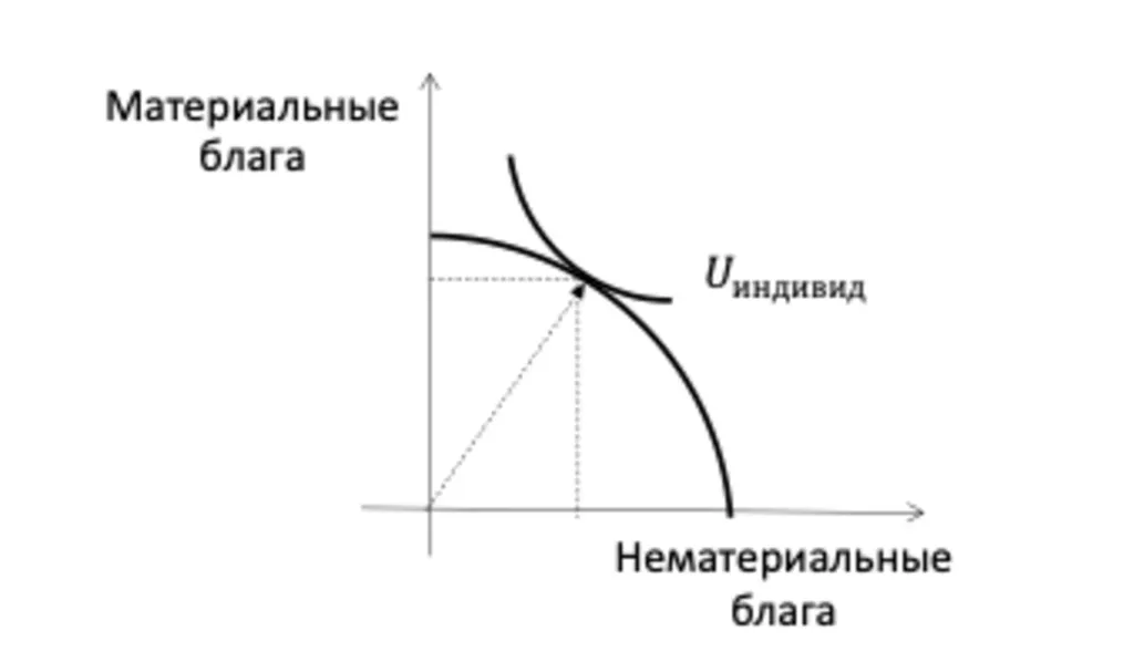 Индивид выбирает некоторое сочетание материальных и нематериальных благ, которое максимизирует полезность его выбора Uиндивид на кривой предложения благ.
