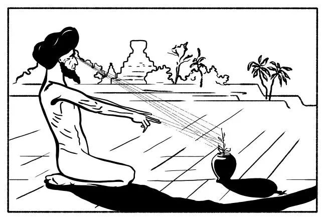 Один из обычных их опытов состоит в следующем: на расстоянии двух аршин от факира, сидящего на полу, ставят горшок с землей, куда сажают зерно какого-либо растения. Он устремляет на него свой взгляд, мало-помалу бледнеет и застывает в своей позе с руками, простертыми к зерну, погруженный, по-видимому, в каталептическое состояние, причем тело его слегка охлаждается.