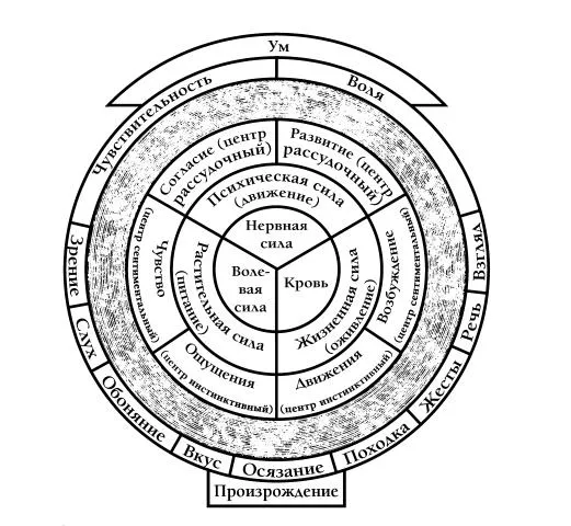 Так, глаза принадлежат собственно человеку, человеку воли, для которого взгляд служит главным средством выражения. Поэтому-то взгляд первый и претерпевает изменение в случаях сумасшествия, опьянения, сомнамбулизма и пр. Гортань как орган речи принадлежит главным образом разумной части человеческого существа, названного нами психическим2.