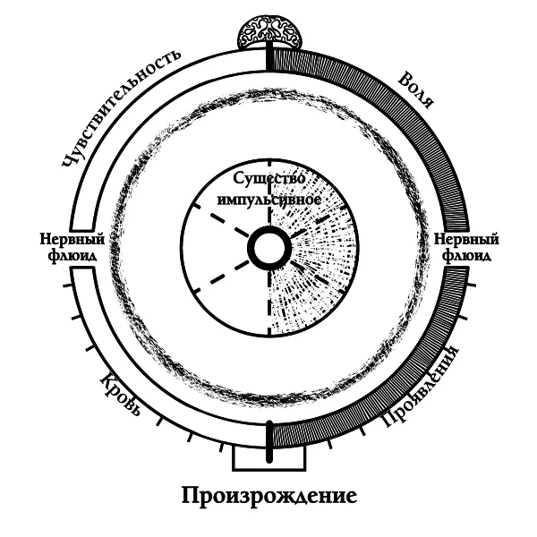 Внизу: анатомически – живот, физиологически – фабрика материи, психологически – область чувств и инстинктов.
