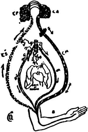 Посредине рисунка слегка обозначены сердце и легкие, приводимые в действие сердечным сплетением (плексус кардиальный – Р. О.) большого симпатического нерва П. С. Н.; он сообщается с передней частью спинного мозга.