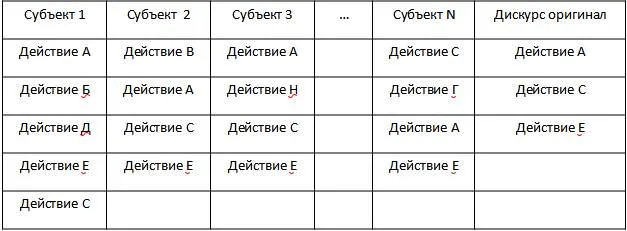 Предположим существование некоей социальной группы субъектов численностью N, члены которой совершают некоторые поступки или действия, представим это в таблице: