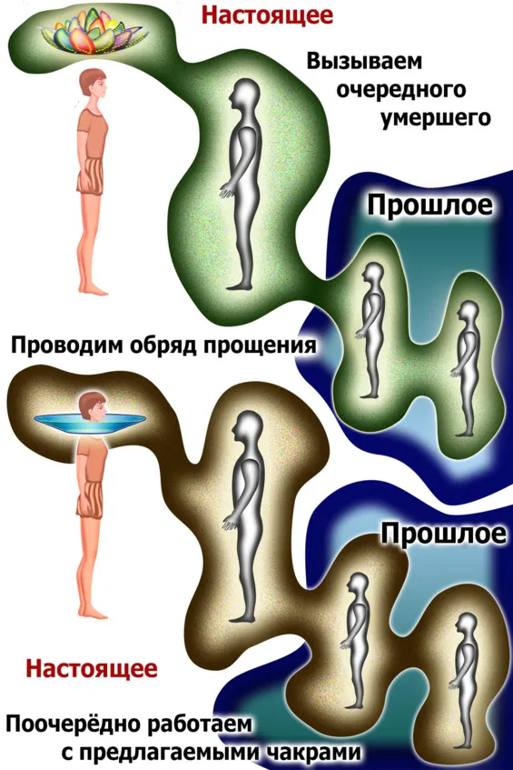 После того, как вы представили картину с привязкой к Сахасраре, мысленно обращаемся к умершему. Если вы работаете с собой, то произносите: