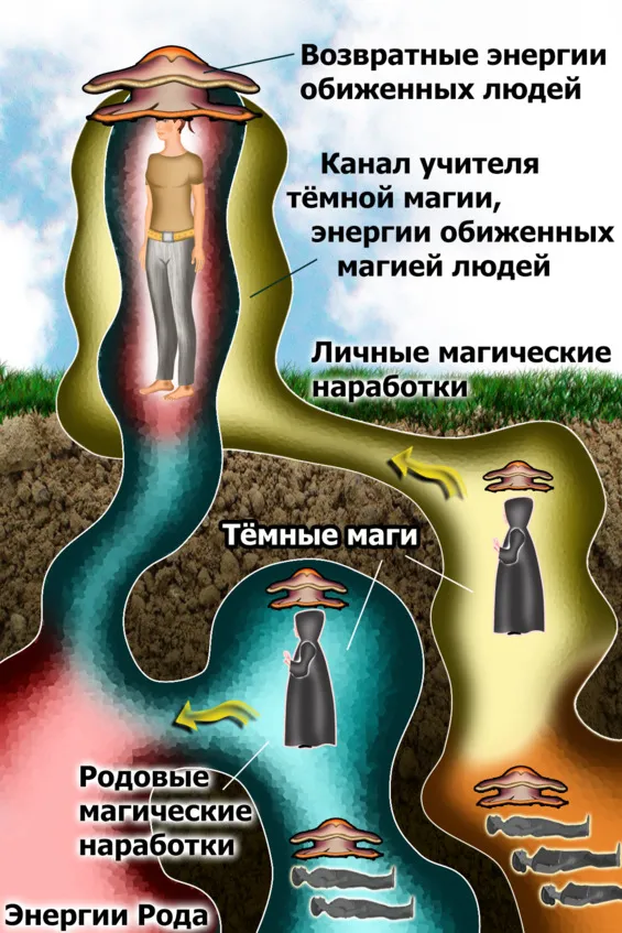 И в том, и в другом случае на человеке, который имеет беспокойство, всегда существует канал, связывающий его с энергетикой тёмного мага. В первом, случае, когда человек или его Род, активно занимался тёмной магией в своих воплощениях – это канал его учителя, или магических учителей его родовых родственников, выбравших в своё время эту стезю.