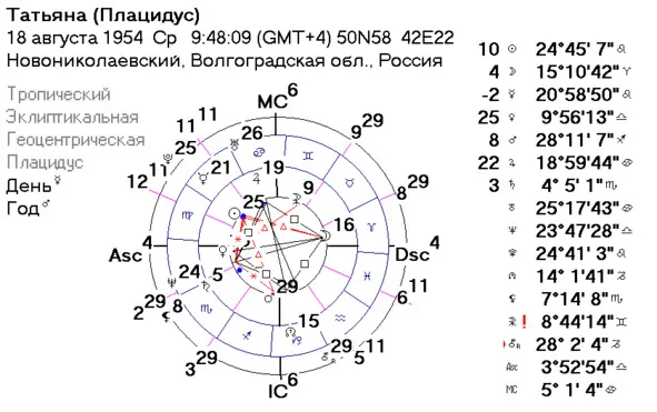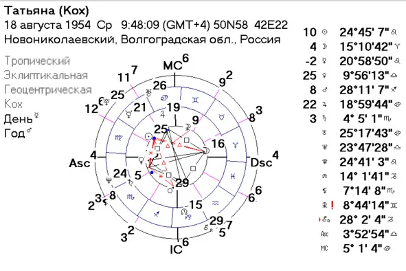 7—3 – проблемы с документами у мужа, у него же возрастает риск ДТП по собственной вине. Впрочем, эта формула будет реализовываться при обеих системах домов, как в Плацидусе, так и в Кохе, поскольку куспид 7 дома в Овне и там, и там, а Юпитер отвечает за дела 3 дома также в обеих системах домов. Поэтому давайте рассматривать 8, 9, 2 и 3 дома, для наглядности так сказать.