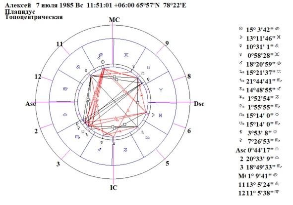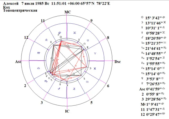 Поскольку поселок Уренгой находится выше 58 гр. СШ, я для составления гороскопа и прогноза для Алексея использую дома Коха (Рис.13).