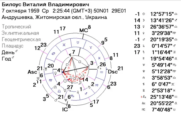 Какие показатели гороскопа убедили меня, что Виталий Билоус стал жертвой преступления? Формула самоубийства выглядит, как 1—8. Управитель 1 дома в момент самоубийства должен образовывать неблагоприятный аспект с натальным управителем 8 дома. Виталий Владимирович – восходящий Лев. В ночь с 18 на 19 сентября 2018 года транзитное Солнце на 26 градусе Скорпиона образует полусекстиль к натальному Меркурию, упр. 2 дома, а поскольку аспект минорный, то, возможно, что в этот день он мог получить крупную сумму денег не для себя. Формула 1—2 – риск финансовых потерь. А, поскольку аспект минорный, Меркурий начинает автоматически выполнят еще и роль управителя 11 дома, сочетая в себе два показателя – 2 и 11 домов. Создаются и работаю две формулы: 1—2 и 1—11 (неприятности из за знакомого, риск финаснсовых потель, возможность травму в обоасти головы, который проходит, как несчастный слечай. Солнце, управитель 1 дома, не образует аспекта к натальному Нептуну, упр. 8 дома. Формулы 1—8 нет. Следовательно, самоубийства не было. Зато с 10 сентября 2018 года транзитный Нептун, управитель 8 дома, начал образовывать квадратуру к натальной Луне, упр. 12 дома. Формула 8—12 – возможность преступления по отношению к человеку. Более того, транзитный Юпитер образует точный аспект к натальному Урану, упр. 7 дома. Формула 5—7 – неудачный период для отдыха с партнерами, поездок с партнерами или женой. Возможность травмы с кровью в области грудной клетки по медицинской астрологии. Транзитная Венера, упр. 10 дома, образует соединение с натальным Нептуном, упр. 8 дома. Налицо два опасных периода, связанных с задействованием в обоих случаях управителя 8 дома (опасные ситуации, связанные с риском для жизни и здоровья).