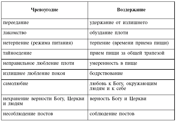 Святитель Игнатий (Брянчанинов) в помощь кающимся описывает противоположную каждой страсти добродетель. В отношении чревоугодия такой добродетелью является воздержание [см.: 6, с. 12].