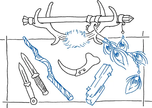 Набор ножей ведьмы может включать в себя орудия с черными и белыми рукоятками, а также серповидный болин и атам из кристалла. Жезлы могут быть изготовлены из древесины дуба, из бузины, ивы или из стеблей фенхеля. Более изысканный жезл может представлять собой медную трубку, наполненную травами и кристаллами, завернутую в кожу или мех и украшенную перьями, янтарем и гагатом. Такой жезл изображен здесь лежащим на оленьих рогах.