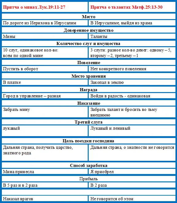 И действительно, в них есть много общего. Но есть между этими притчами и существенная разница. Из этого мы можем прийти к заключению, что в этих притчах описываются, хотя и подобные, но все же, не одни и те же духовные делания.