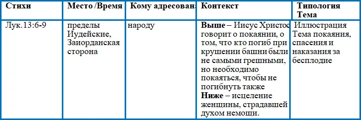 Что касается упоминаемых в притче „трех лет“, то одни толкователи видели здесь обозначение трех периодов домостроительства Божественного – закона, пророков и Христа, другие – указание на трехлетнее служение Христа. Но все эти толкования не имеют основания в самой притче, детали которой, как и всякой притчи вообще, не нуждаются в изъяснении: важно только оттенить главную мысль притчи, а эта мысль вполне ясна всякому».