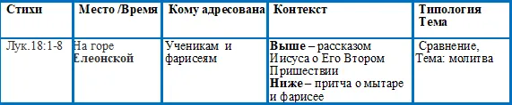 «Притча разъясняет заповедь Христа о необходимости всегда молиться и не унывать, ибо, если неотступность вдовы побудила судью неправедного заступиться за нее, то возможно ли думать, что Судья Праведный, то есть Бог, не услышит молитв человека и не сделает благо ему?