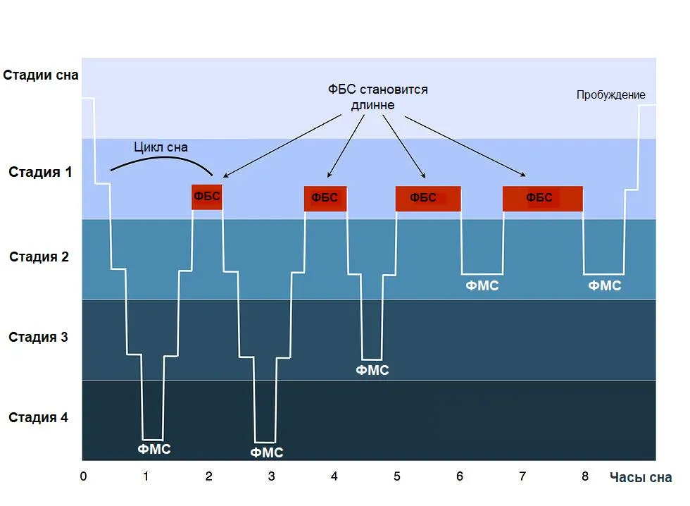На рисунке 1 схематически показано, как меняются фазы сна в течение ночи. Видно, что сон идёт циклами, которые заканчиваются сразу после окончания ФБС. Эти циклы длятся в среднем 1,5 часа. Многие ошибочно думают, что цикл сна у всех людей всегда длится строго 1,5 часа, но это не так. Длительность цикла меняется с возрастом, в зависимости от режима сна, поведения, приёма алкоголя и других факторов. Даже на рисунке циклы сна длятся не строго 1,5 часа. Человек засыпает и погружается в фазу медленного сна. Спустя около 1,5 часов попадет в первую фазу быстрого сна. Затем цикл повторяется.