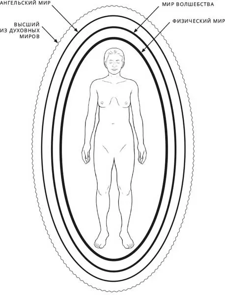 Рис. 4. Воображаемые чакры. Воображаемые миры являются тонкими мирами существования, в которые можно попасть благодаря экстрасенсорным способностям. Их можно представить в виде концентрических кругов вокруг тела. Самые плотные миры – те, что находятся ближе всего к физическому плану, а более эфемерные расположены дальше