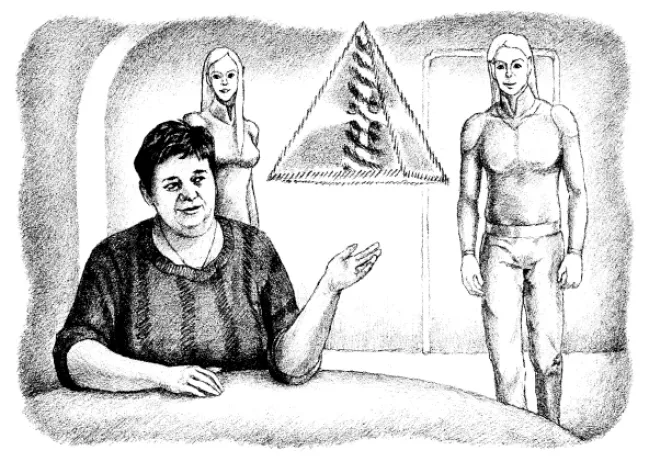 В комнате стояла девушка – представительница Бурхада. Она предложила мне снять обувь и лечь в капсулу. Я так и сделала. Крышка капсулы закрылась, послышался тихий свист, и ненадолго стало темно. Через несколько секунд внутри капсулы появилась излучающая белый свет спираль, ритмически пробегающая по стенам, дну и потолку капсулы. Снова послышался свист, и у меня появилось ощущение, будто всё моё сознание, моё «Я» переворачивается и изменяется.