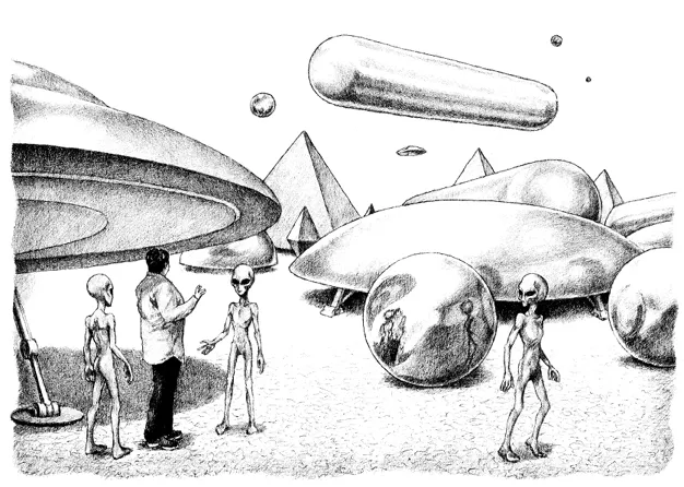 Мы вышли на середину поля. Вокруг нас стояли деревянные скамьи, немного спиралеобразно поднимающиеся вверх. На них сидели гуманоиды, которые собрались со всей Галактики и внимательно смотрели на меня. Раом Тийан показал на овальную платформу, лежащую на белом, как мел, грунте, и сказал, чтобы я встала на неё. Я так и сделала. Платформа стала плавно подниматься вверх и, достигнув высоты примерно семь-десять метров, остановилась.