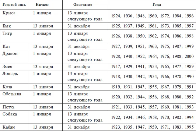 Второй, еще более надежный способ – это сравнение с определенными возрастными психологическими стереотипами. Крыса соответствует психотипу студента (17–24), Бык – психотипу подростка (12–17), Тигр – психотипу мудреца, Кот – психотипу пенсионера (TOSS), Дракон – психотипу человека руководящего возраста (55–70), Змея – психотипу человека возраста быстрой реализации (40–55), Лошадь – психотипу младшего школьника (7—12), Коза – психотипу дошкольника (3–7), Обезьяна – психотипу малыша (1–3), Петух – психотипу абстрактного мыслителя, Собака – психотипу деятельного человека (31–40), Кабан – психотипу молодого специалиста (24–31).