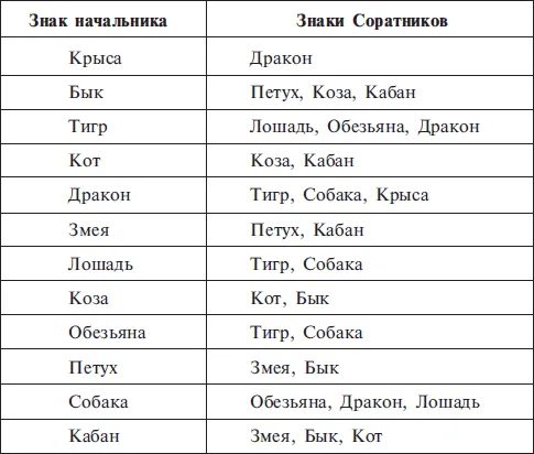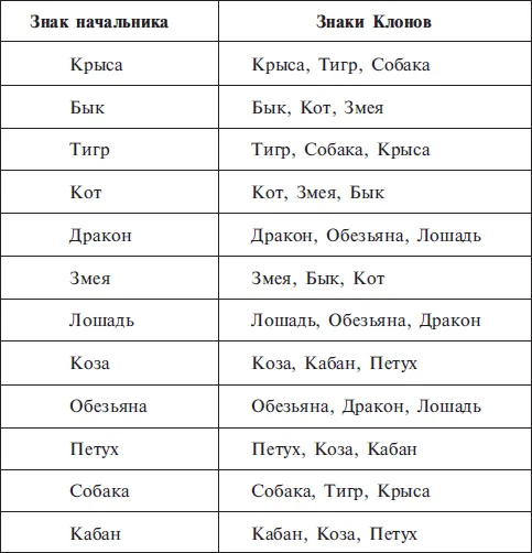 Вторым делом вычисляются Соратники и Клоны. Клоны – это знаки единой тройки судьбы. Тройки таковы: тройка Самодельщиков – Лошадь, Дракон, Обезьяна, тройка Фаталистов – Тигр, Собака, Крыса, тройка Пионеров – Петух, Коза, Кабан, тройка Реализаторов – Кот, Бык, Змея. Для вычисления Соратников надо найти знаки сопряженных стихий. Самодельщики взаимно сопряжены с Фаталистами, а Пионеры взаимно сопряжены с Реализаторами. Клон и Соратник располагаются во втором круге, Клон в минусе, Соратник в плюсе.