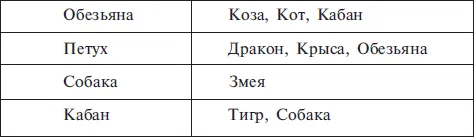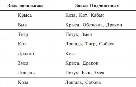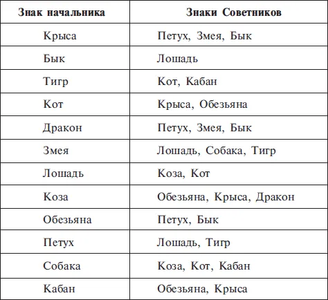 В третью очередь надо найти знаки Советников и Подчиненных. Для этого надо знать систему энергетического превосходства. Знаки Логики (Петух, Змея, Бык) доминируют над знаками Мистики (Крыса, Дракон, Обезьяна), те, в свою очередь, доминируют над знаками Реализма (Кот, Коза, Кабан), которые доминируют над Волевыми знаками (Лошадь, Собака, Тигр). Наконец, Волевые знаки, замыкая круг, доминируют над Логиками. Доминирующие знаки образуют группу Советников, а знаки подчинения образуют группу Подчиненных. Это третий круг, Советники в минусе, Подчиненные в плюсе.
