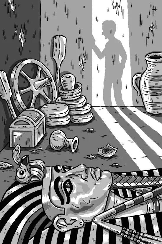 Гробницу Тутанхамона обнаружил британский археолог Говард Картер. Но на это ему потребовалось время. Он копался в песке с 1917 по 1922 годы в поисках юного фараона. В ноябре 1922-го шел последний сезон раскопок, после которого спонсор Картера Джордж Герберт, пятый лорд Карнарвон, должен был прекратить его финансирование. Один из местных работников, нанятых Картером, наткнулся на камень, который затем оказался первой из шестнадцати засыпанных песком ступенек. Расчистив ход к двери у подножия ступеней, Картер из чувства долга приказал засыпать все обратно. Затем он телеграфировал лорду со следующим посланием: «Нашел гробницу пацана. Давайте вскроем ее вместе»7.