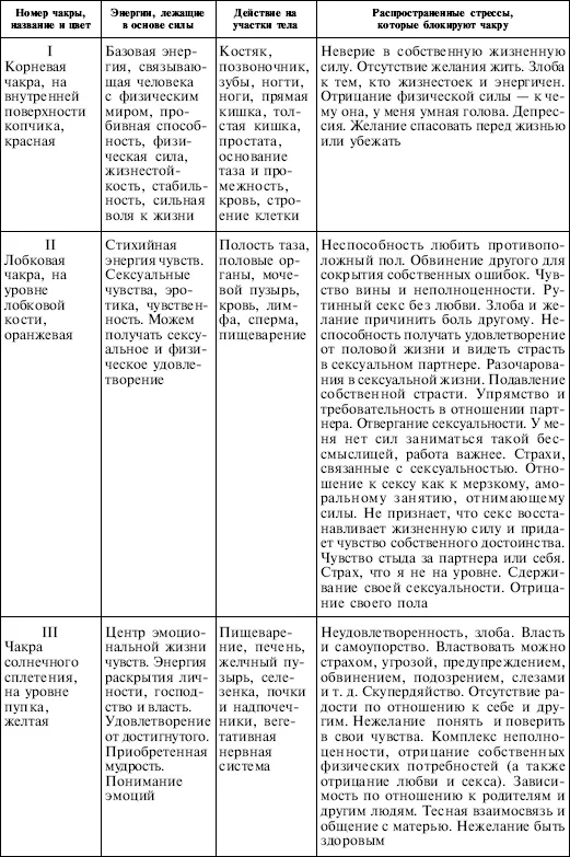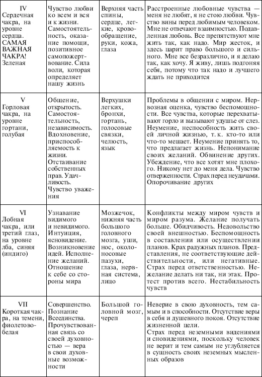 Посмотрите на характеризующую каждую чакру схему и почувствуйте, как она влияет на все тело. Вы испытываете очень своеобразные медитативные ощущения в каждом индивидуальном случае.