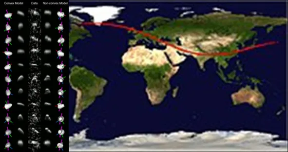 Слева: Сравнение наиболее подходящих моделей выпуклой и невыпуклой форм и некоторых доступных радиолокационных изображений (99942) Апофис; Справа: Коридор гипотетического риска удара 13 апреля 2029 г. на основе учений по планетарной обороне 2020—21 годов.