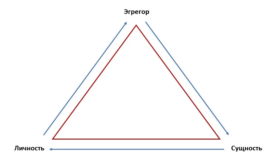 Личности, сущности и эгрегор влияют не только на социум, но и друг на друга. Так, сильная личность может создать какой-то эгрегор, а он впоследствии способен начать влиять на неё. Либо наоборот, эгрегор возносит какого-то нужного ему человека на вершину, и тот, получив деньги и власть, становится его ярым защитником. Такое взаимодействие всегда осуществляется через сущности. Это «слуги», защитники и верные подданные любого эгрегора. Все эти взаимоотношения объединяет Треугольник эгрегора. В этом взаимодействии эгрегор влияет на сущность, сущность – на личность, а личность – на эгрегор.