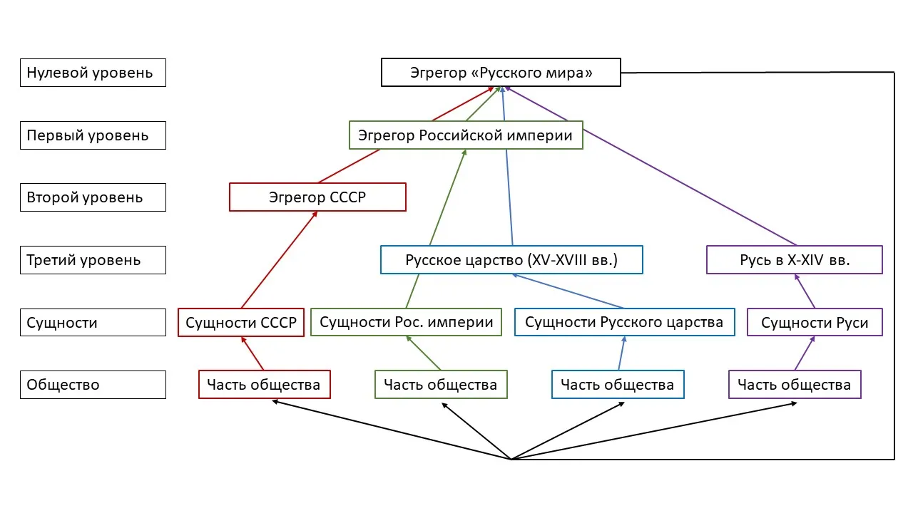 В этом примере эгрегор нулевого уровня подпитывается эгрегорами более низкого порядка (первый, второй, третий уровень). Уровней может быть значительно больше, чем они выше, тем сильнее, т.е. тем большее количество людей подпитывают их. Для нулевого эгрегора нижележащие являются сущностями, т.е. они аккумулируют поступающую от какой-то части общества энергию и передают её выше. Несмотря на то, что эгрегоры низших уровней могут конфликтовать между собой, тем не менее они наполняют главный, по факту, действуют в этом аспекте сообща. Другими словами, среди людей, причисляющих себя к русскому миру, часть может придерживаться одних политических, мировоззренческих или религиозных взглядов, но, по факту, они все укрепляют эгрегор русского мира. Таким образом, эгрегоры низших уровней выполняют функцию сущностей для базового нулевого эгрегора.