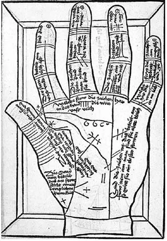 Схематическое изображение руки и линий из трактата по хиромантии Иоганнеса Хартлиба (ок. 1410–1468)