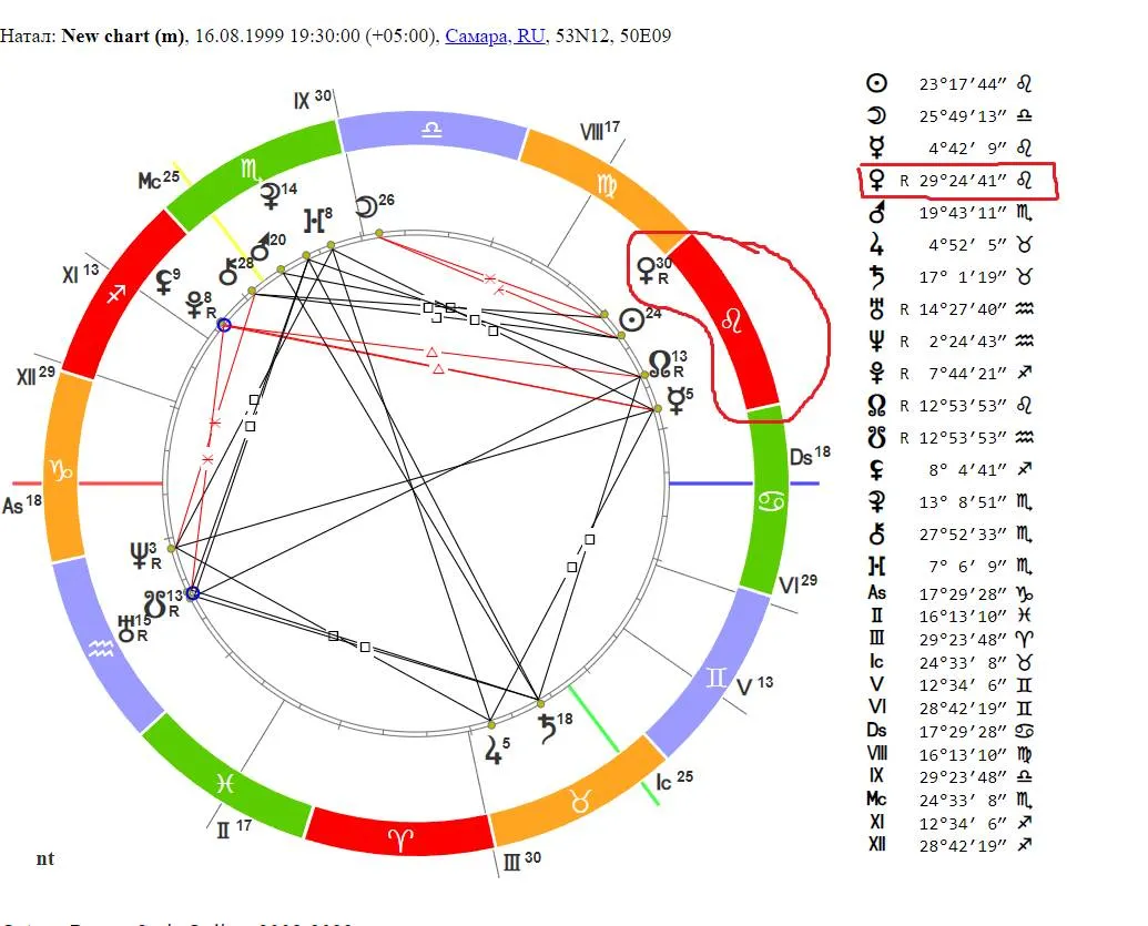 Итак, теперь вы видите личную натальную карту. Нам необходимо найти знак Венеры в правой табличке и непосредственно на самой карте (выделено красным).