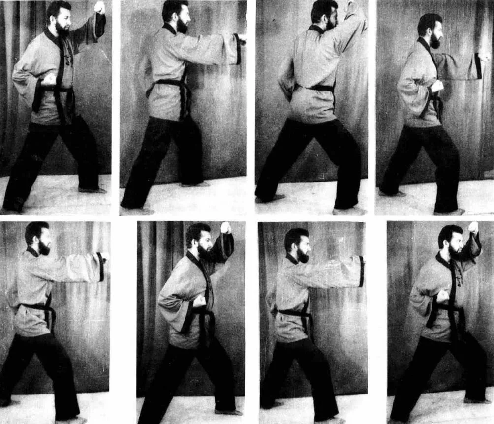 Во время отработки в КИХОН движений, выполняемых в задней стойке, следует обратить особое внимание на отработку приемов с переходом в эту стойку. И вообще, нам хотелось бы предостеречь вас от чрезмерного увлечения отработкой приемов в движении вперед. Вы должны уделять больше внимания движению назад, работая в задней стойке. После выполнения необходимого количества шагов в одном направлении, разворачивайтесь на 180 градусов и, плавно вращая бедрами, перенесите центр тяжести на заднюю ногу для последующего движения в обратном направлении.