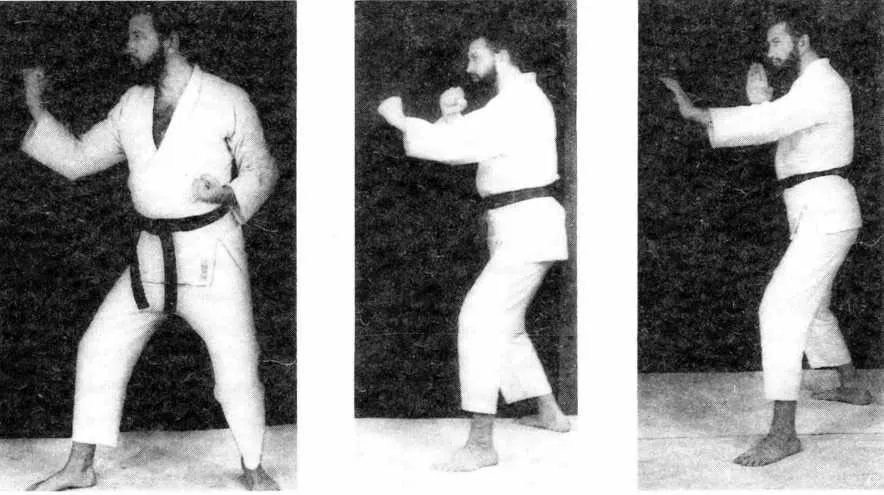 Кулак согнутой в локте руки находится на высоте плеча и отстоит от него на 35 см., локоть этой руки отделен от груди расстоянием, равным расстоянию между концами большого и указательного пальцев (около 15 см.). Глаза не отводить от плеч противника.