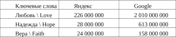 К тому же впервые над тем, что значит любить, мы задумываемся в юности, и вполне очевидно, что в поисках ответа на этот вопрос наши современники вряд ли сразу обратятся к Евангелию, трудам святых Отцов или христианских философов. Скорее всего, они наберут вопрос «что значит любить?» в поисковой строке своего браузера и через долю секунды всемирная сеть даст ответ – причем не один, а 226 млн. ответов – именно столько ссылок мы получили, набрав в русскоязычном Яндексе слово «любовь». Для сравнения на слова «вера» и «надежда» Яндекс предложил соответственно 24 и 28 млн. ссылок. Набрав в англоязычном Google эти же запросы на английском языке, мы получили 158 млн. ссылок на слово «faith» (вера), 613 млн. ссылок на слово «hope» (надежда) и 2 млрд. 10 млн. ссылок на слово «love» (любовь). Так интернет, сам того не ожидая, подтвердил слова Апостола Павла из Послания к Коринфянам: «А теперь пребывают сии три: вера, надежда, любовь; но любовь из них большее» (1 Кор. 13, 13).