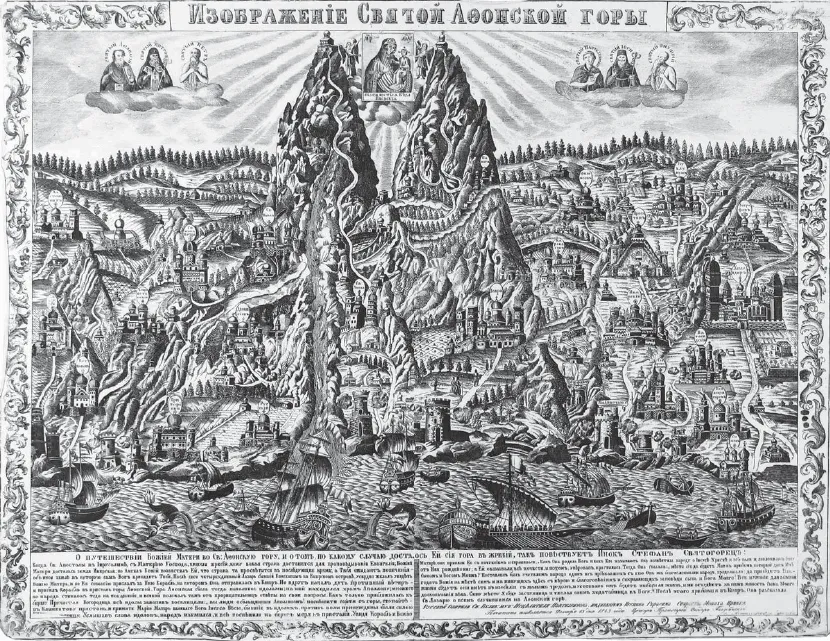 Святая Гора Афонская. Гравюра 1843 года. Издание русского Пантелеимонова монастыря иждивением игумена Герасима
