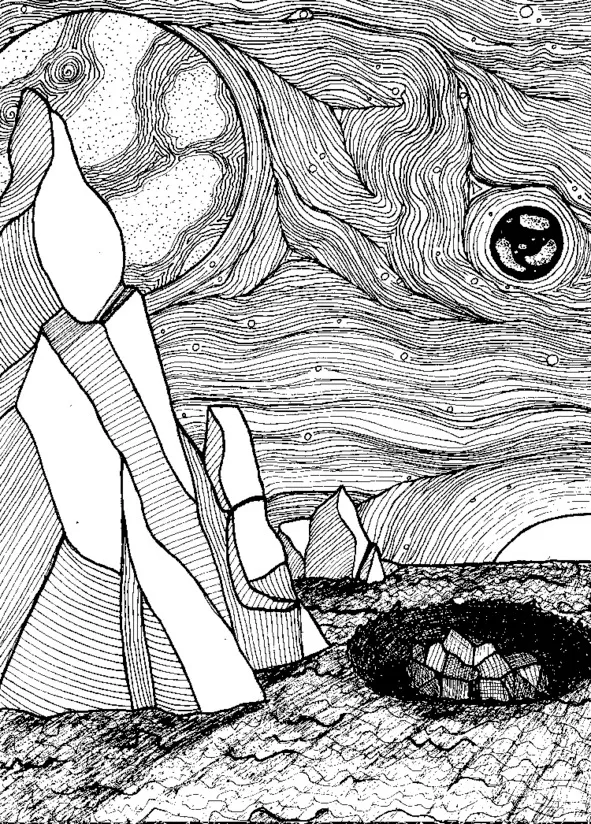 Моя душа, находясь в скале, путем безмолвия пытается постичь нечто важное. То, что прилетело, имеет другую, более мягкую структуру. Проходят сотни лет, и метеорит постепенно разрушается, рассыпаясь, оплывая и заполняя собой впадину, которая образовалась при его падении. Я чувствую его всё меньше и меньше, сигнал, исходящий от него, становится слабее и слабее. Он остается лишь пыльным пятном рядом с моей скалой.