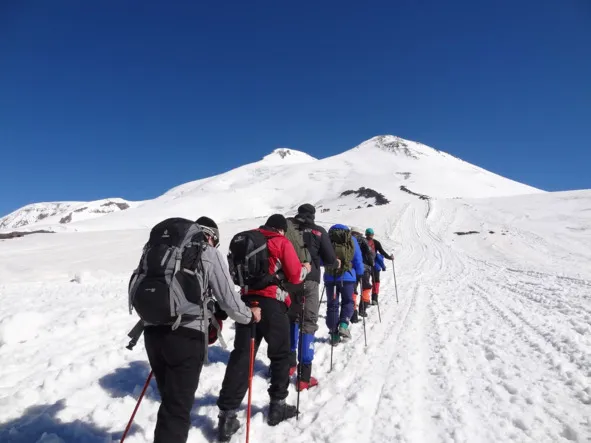 Но вне зависимости от этого акклиматизационный выход до скал Пастухова на высоту 4800 метров ни кто не отменял. Подобного рода выходы, вне зависимости от мастерства и уровня подготовки, необходимы для того чтобы организм смог адаптироваться к условиям Эльбруса. В своё время, в горах я встречал альпинистов, которых отбирали для восхождения в Гималаях. Так у них был тест: взойти на вершину Эльбруса – бегом. Но в нашем случае была задача просто взойти. Поэтому на следующее утро, скорее ещё в ночь, а точнее в 2 часа ночи начали подъём. Чем характерен был этот подъём? Во – первых тем, что чем выше забираешься, тем большее количество вдохов – выдохов совершаешь на каждый шаг и во-вторых, степень восторга от окружающей обстановки резко уменьшается. Это минусы. А плюс то, что никаких вертикальных стен, а просто снежный, даже не очень крутой склон, по которому необходимо было подняться.