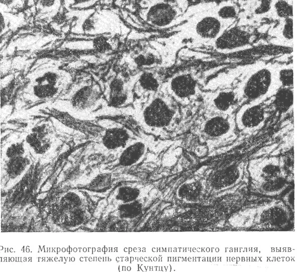 Клетки мозга в старости: видно, что большая площадь клеток занята липофусцином (черные вкрапления) – инертным «загрязняющим» клетки веществом.