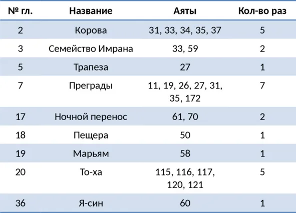 – «Семейство Имрана», «Трапеза», «Марьям» и «Я-син» (лишь имя).